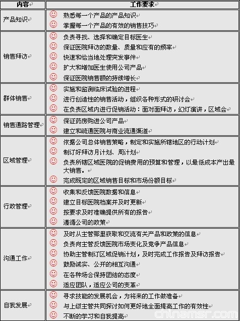 医药代表的基本岗位职责是在负责区域内科学推广公司产品,确保在实现销售目标的同时,建立公司产品在医生心目中的药品定位。为了完成这个职责医药代表需要努力完成以下工作目标。首先医药代表必须熟悉每一个产品的产品知识,保证准确无误地向客户传达药品的信息,树立公司的专业、负责的良好形象。医药代表必须学习并掌握每一个产品的销售技巧,通过对客户专业化地面对面拜访和产品演讲,说服客户接受公司的产品。医药代表必须在所辖区域医院努力完成公司下达的销售目标。医药代表作为企业的代表必须积极地与医院、商业等客户建立良好的合作关系,并保持密切联系。医药代表必须亲自制定并实施所辖区域的行动计划,积极组织医院内各种推广活动。医药代表必须坚持以最低成本创造最大的销售额和市场份额。制药企业对医药代表的工作评估一般从以下几个方面进行:医药代表在所负责的区域市场内销售指标的完成情况;公司产品各个医院覆盖率;不同医院用药的增长率;总体目标医生的覆盖率;区域内产品推广活动的完成情况;销售报表的填写情况。