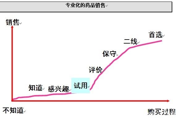 药品销售是一个规律的发生过程,医药代表的工作,便是准确判断客户所处的认知阶段,通过专业的销售技巧作为载体,推动客户有条不紊的向更高一级迈进,直到顶点,并且不断重复上述循环。医药职业经理人,通过管理手段,观察期间的发生过程,便是重要的岗位职责,我们所描述的协同拜访,也是这样一个细腻的过程。