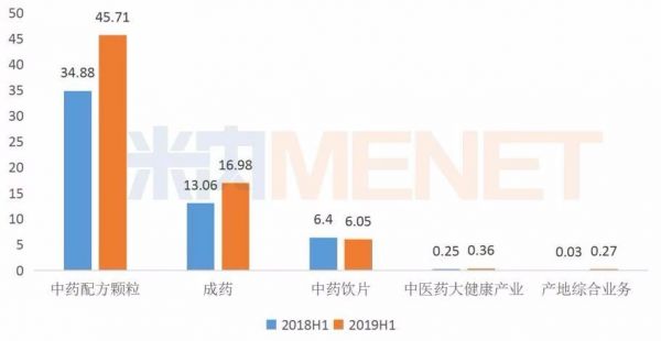 中国中药2019上半年营业额约为69.37亿元,同比增长27.0%,主要得益于中药配方颗粒业务继续保持高速稳定增长和成药业务在OTC渠道的发展。其中,中药配方颗粒业务贡献营业额约45.71亿元,同比增长31.1%,占总营业额的65.9%;中药饮片业务营业额约6.05亿元,同比下滑5.4%,占总营业额的8.7%。