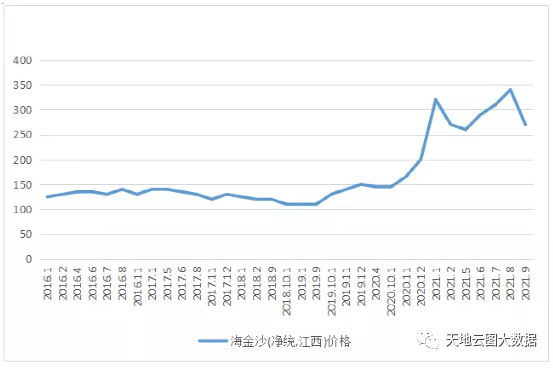 2017年从130元下滑至120元左右;2018年产新时,从120元再次下滑至110元;2019年产区前期先旱后雨,减产减收,产新后海金沙价格升至150元,后由于产新量不足以满足当年订单需求,使得其行情并未快速回落,价格保持在2020年三季度产新前的140元。