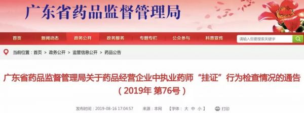 8月16日,广东省药监局发布《关于药品经营企业中执业药师“挂证”行为检查情况的通告(2019年 第76号)》。