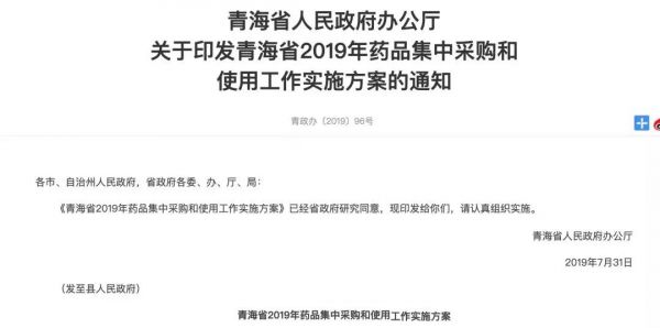 8月19日,青海省人民政府网挂网《青海省人民政府办公厅关于印发青海省2019年药品集中采购和使用工作实施方案的通知》(以下简称《通知》),要求对三类药品进行集中采购,其中,对于采购数量大、采购金额高的药品,要求以国家卫生健康委公布的重点监控药品目录为依据,制定采购目录,进行集中招标采购。