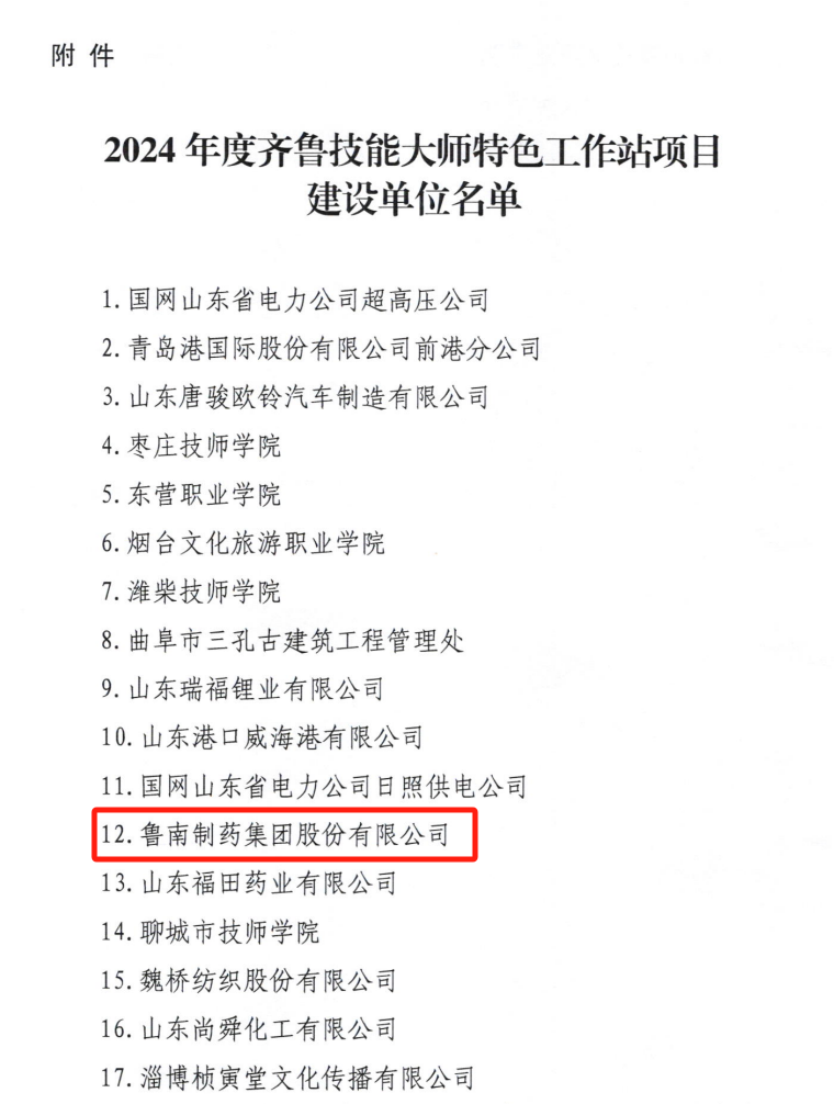 近日,山东省人力资源和社会保障厅发布《关于公布2024年度齐鲁技能大师特色工作站项目建设单位的通知》,鲁南制药集团股份有限公司获批齐鲁技能大师特色工作站。