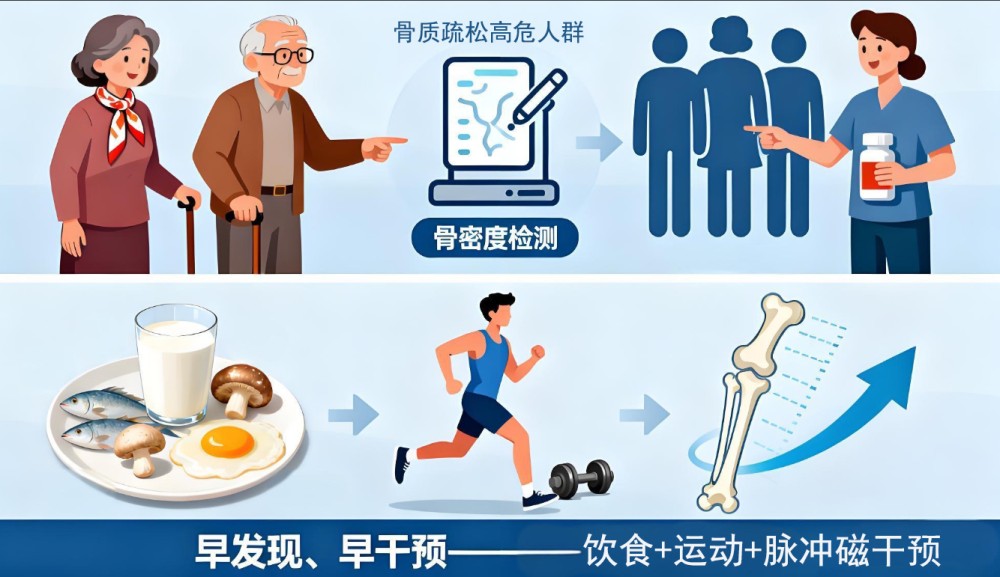 对于骨质疏松症的高危人群,包括绝经后女性、老年男性、有骨质疏松家族史者、长期服用激素类药物者等,应尽早进行骨密度检测,做到早发现、早干预。除了采用必要的治疗手段外,还应结合饮食调理,多摄入富含钙、维生素D的食物,同时保持规律的运动习惯,从多方面入手增加骨密度、降低骨折风险,切实促进全身健康。