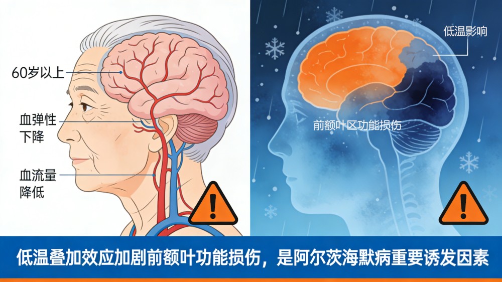 从生理机制来看,冬季低温会刺激人体交感神经兴奋,导致全身血管收缩,脑部血管也会随之收缩,前额叶区的脑血流量减少。而前额叶区的神经元对血氧供应要求极高,长期或反复的血氧灌注不足,会导致神经元代谢效率下降、突触连接功能减弱,进而表现为记忆力减退、思维迟钝、情绪波动等症状。对于60岁以上人群,其脑部血管弹性下降、脑血流量本就处于生理性降低状态,低温带来的叠加效应会进一步加剧前额叶区的功能损伤,成为阿尔茨海默病的重要诱发因素。