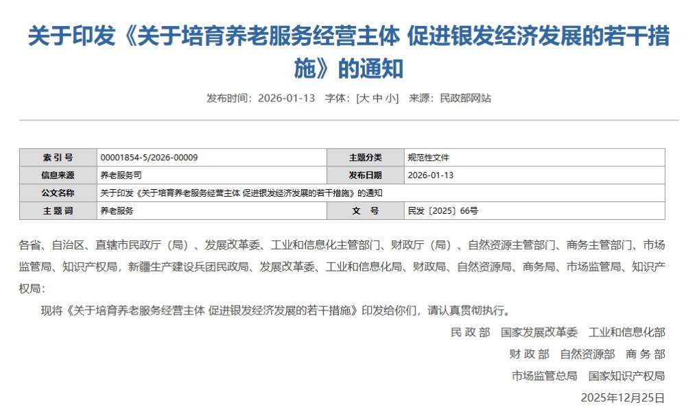 民政部等八部门近日联合印发《关于培育养老服务经营主体促进银发经济发展的若干措施》,围绕品牌建设、供需对接、科技赋能、环境优化和要素扶持五大维度,推出14项具体举措,为我国养老服务提质升级与银发经济高质量发展注入强劲政策动力。