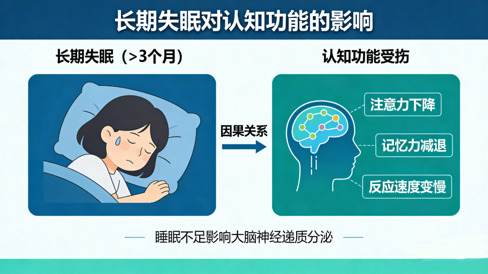 长期失眠对认知功能的损害是多维度、渐进式的。睡眠状态下,大脑本应完成代谢废物清理、记忆巩固与神经修复,而失眠会打断这一关键过程,直接导致注意力与专注力下降、记忆力明显受损、决策与判断力降低、情绪调节能力变差、反应速度与运动协调能力减弱,形成“越睡不着、脑子越不好用”的恶性循环。