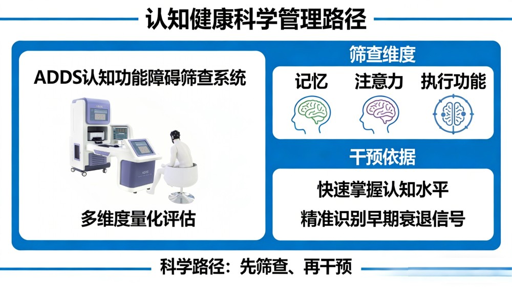 守住认知健康,先筛查、再干预是科学路径。借助ADDS认知功能障碍筛查系统,对记忆、注意力、执行功能等进行多维度量化评估,快速掌握当前认知水平,精准识别早期衰退信号,为干预提供客观依据。