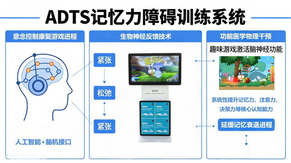 针对已出现的认知下降,ADTS记忆力障碍训练系统可提供靶向干预。该系统采用意念控制神经康复模式,通过“紧张—松弛—紧张”的训练节奏,以趣味游戏的方式激活脑神经功能,系统性提升记忆力、注意力、决策力等核心认知能力,延缓记忆衰退进程。