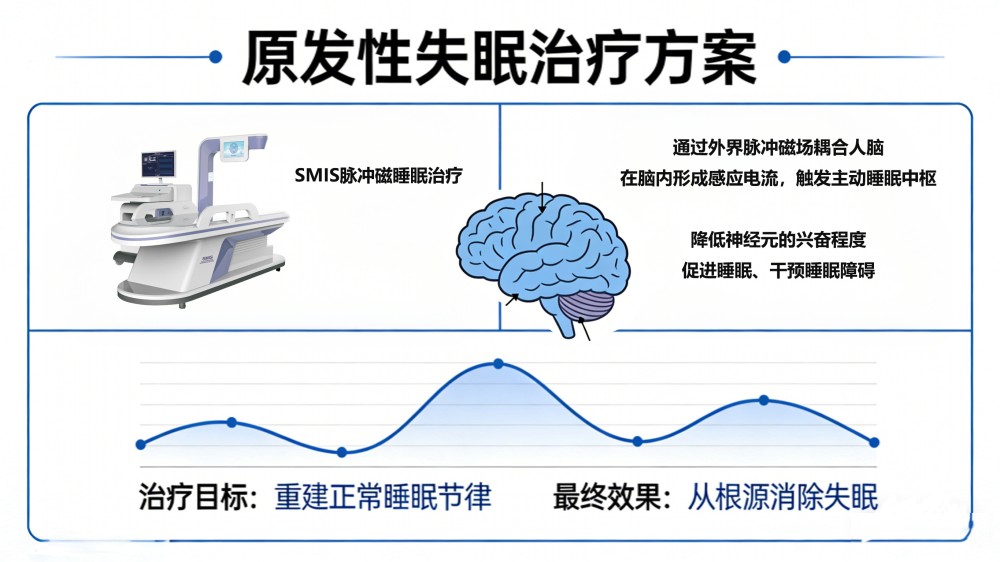 在改善认知的同时,必须同步解决失眠根源。科学睡眠管理遵循“先分型、再施策”原则:首先明确失眠成因、类型与严重程度;随后制定个性化干预方案。继发性失眠以治疗基础疾病为主,原发病好转后,失眠通常随之改善;原发性失眠多采用脉冲磁睡眠治疗等物理手段,或“物理干预+药物”的联合方案,帮助重建正常睡眠节律,从根源消除失眠。