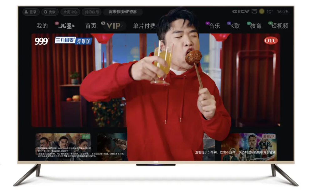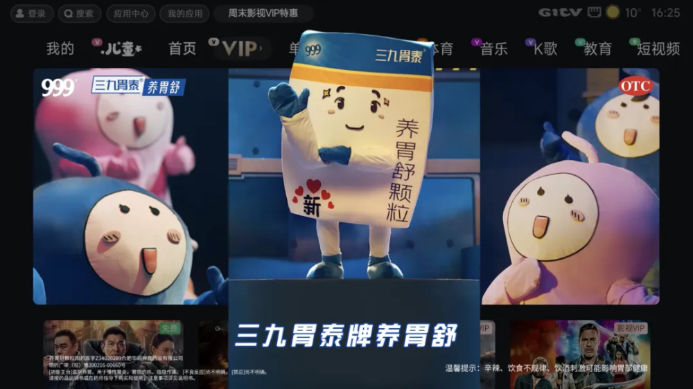 通过开机广告强势触达、大视界广告中心展示,OTT超大画幅强视觉呈现使品牌信息形成全方位包围式触达,让三九胃泰成为春节家庭健康的专属 “守护者”,在情感共鸣中完成品牌价值的深度传递,尽显医药大品牌的专业质感,进一步夯实品牌公信力。