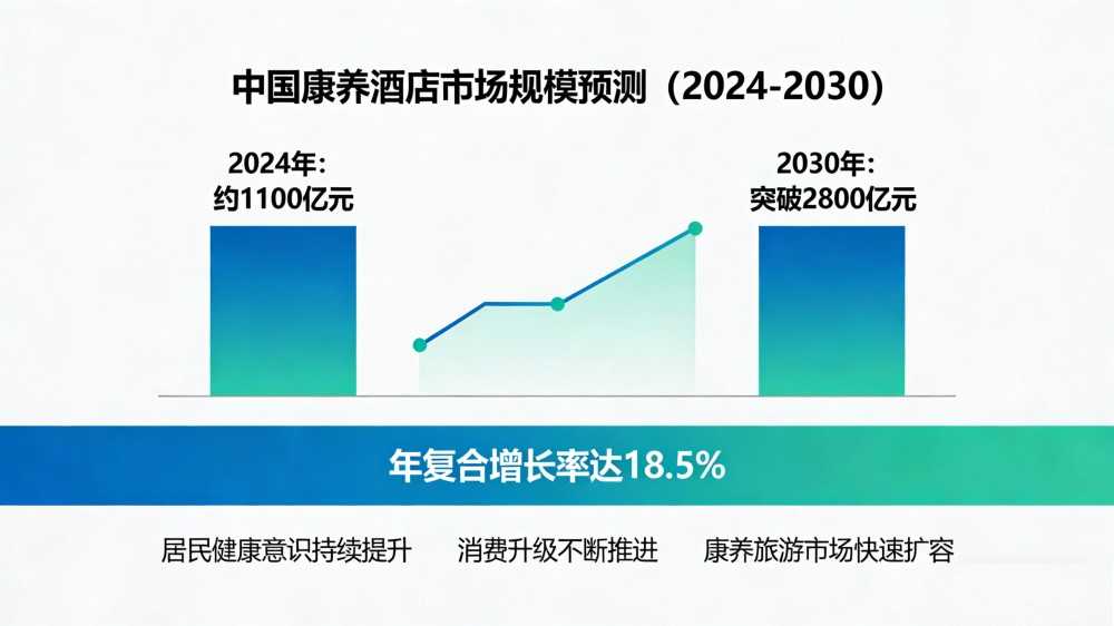市场的热度与数据,印证着康养酒店的巨大发展潜力。据行业测算,2024年中国康养酒店市场规模约1100亿元,随着居民健康意识的持续提升、消费升级的不断推进,以及康养旅游市场的快速扩容,这一数字仍在稳步攀升,预计到2030年市场规模将突破2800亿元,年复合增长率达18.5%。这一增速远超传统酒店行业平均水平,也折射出当下人们对“健康+度假”融合模式的强烈需求,康养酒店正从行业蓝海逐渐成长为文旅康养产业的核心增长极,吸引着资本与市场的双重关注。