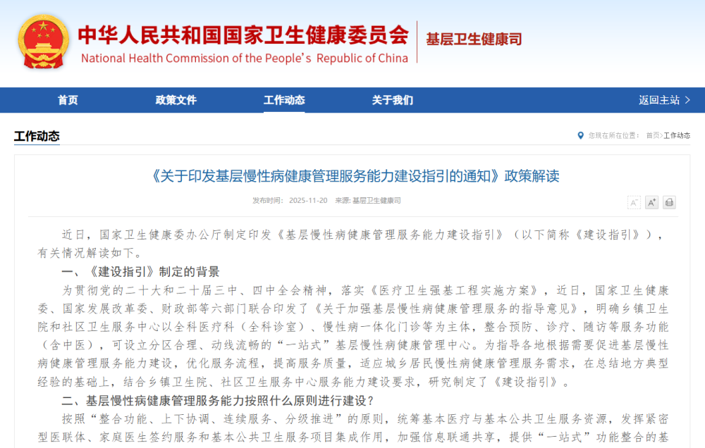 慢性病管理是基层医疗卫生服务的核心任务之一,关乎亿万群众的健康福祉。11月20日,国家卫生健康委办公厅正式发布《基层慢性病健康管理服务能力建设指引》(以下简称《指引》),明确提出指导各地根据实际需求促进基层慢性病健康管理服务能力建设,推动提供“一站式”功能整合的健康管理服务,这一举措将为基层慢性病管理领域带来全新变革,让群众在家门口就能享受到全周期、一体化的健康保障。