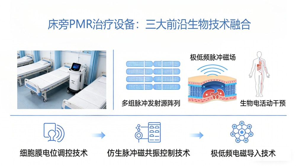 作为科技与医疗深度融合的产物,床旁PMR治疗设备的诞生,打破了传统康复治疗的局限,其核心优势源于三大前沿技术的深度融合——细胞膜电位调控技术、仿生脉冲磁共振控制技术和极低频电磁导入技术,通过多组脉冲发射源阵列重组,设备可精准发射极低频脉冲磁场,温和作用于人体内部,科学干预体内生物电活动。