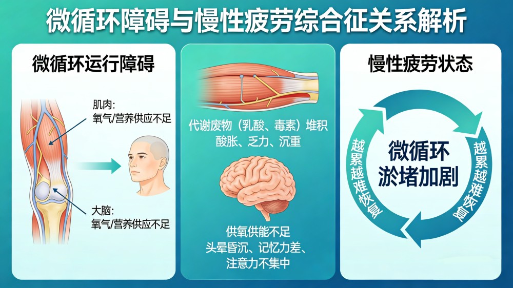 现代医学研究表明,慢性疲劳综合征的发生发展,与微循环障碍密切相关。微循环作为人体血液物质交换的“末梢通道”,一旦出现运行障碍,肌肉、大脑等关键器官的氧气和营养供应就会不足,代谢产生的乳酸、毒素等废物也无法及时排出。肌肉代谢废物堆积,便会引发酸胀、乏力、沉重;大脑供氧供能不足,就会出现头晕昏沉、记忆力差、注意力不集中等症状,这正是慢性疲劳综合征的核心发病机理。而长期的慢性疲劳状态,又会进一步加剧微循环淤堵,形成恶性循环,让身体陷入越累越难恢复的困境。