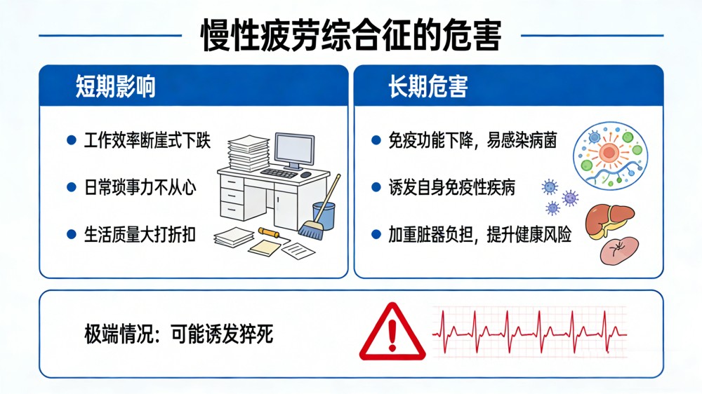 慢性疲劳综合征的危害不容小觑。短期来看,它会直接导致工作效率断崖式下跌,日常琐事都变得力不从心,生活质量大打折扣;长期放任不管,会引发机体免疫功能下降,让人更容易遭遇病菌感染,甚至诱发自身免疫性疾病。更需要警惕的是,长期严重的慢性疲劳,会加重身体脏器负担,大幅提升健康风险,极端情况下甚至可能诱发猝死,酿成无法挽回的悲剧。