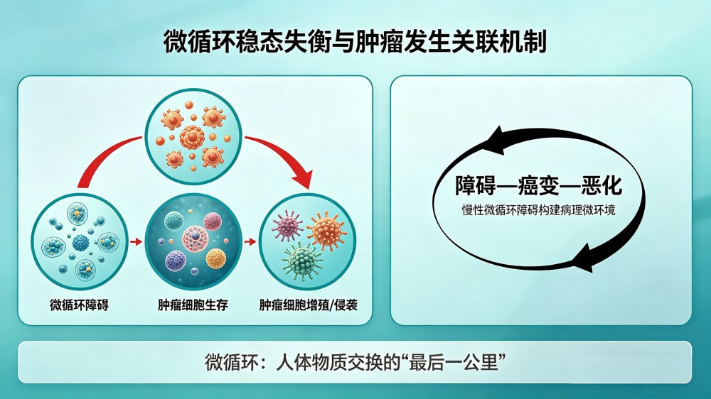 微循环作为人体物质交换的“最后一公里”,其稳态失衡是肿瘤发生的重要诱因与推进器。临床研究证实,慢性微循环障碍会构建出适宜肿瘤细胞生存、增殖、侵袭的病理微环境,形成“障碍—癌变—恶化”的恶性循环。