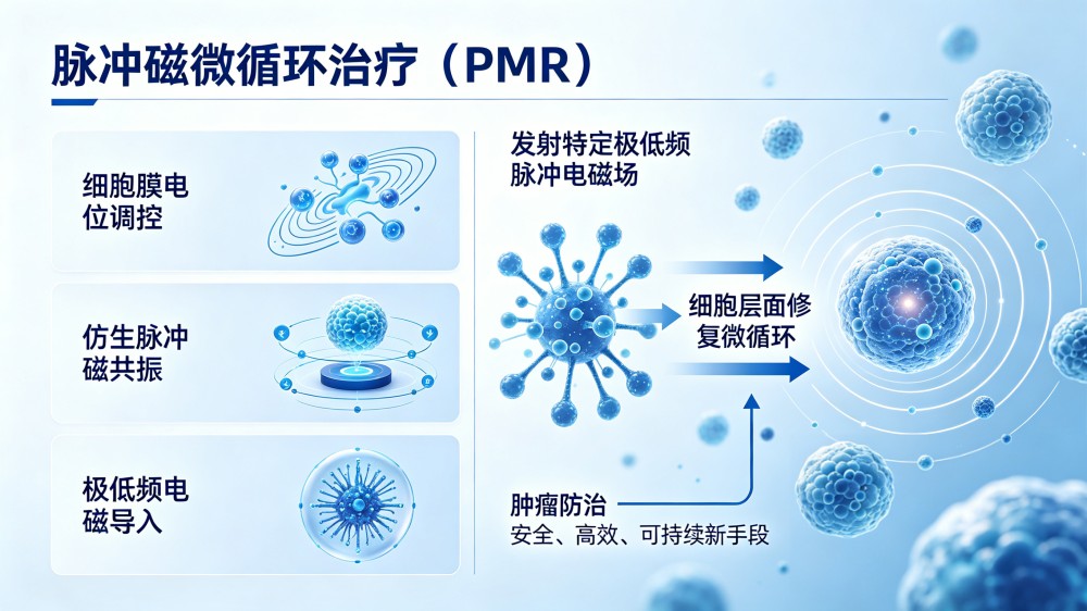 脉冲磁微循环治疗(PMR) 作为无创物理干预技术,依托细胞膜电位调控、仿生脉冲磁共振、极低频电磁导入三大核心技术,通过发射特定极低频脉冲电磁场,从细胞层面修复微循环,为肿瘤防治提供安全、高效、可持续的新手段。