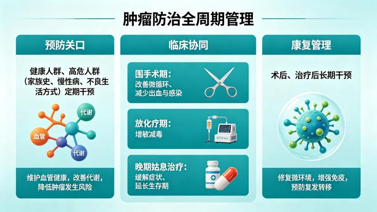 康复管理:术后、治疗后长期干预,修复微环境,增强免疫,预防复发转移。