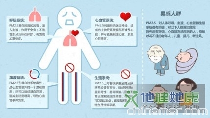 心血管系统:PM2.5刺激肺内迷走神经,造成主神经紊乱从而波及心脏,并可直接到达心脏,发生心肌梗塞。