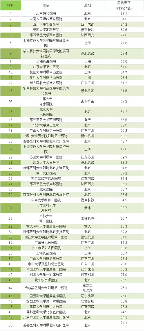 结合医信天下团队中国医学科学院医学信息研究所许培扬先生、徐立水先生领衔的专家评定,分析研究医院科研水平和临床技术水平,对医院做出技术评价和综合评价。并按照一定比例换算得出总排名分值,即医信天下中国医院影响力排行榜。