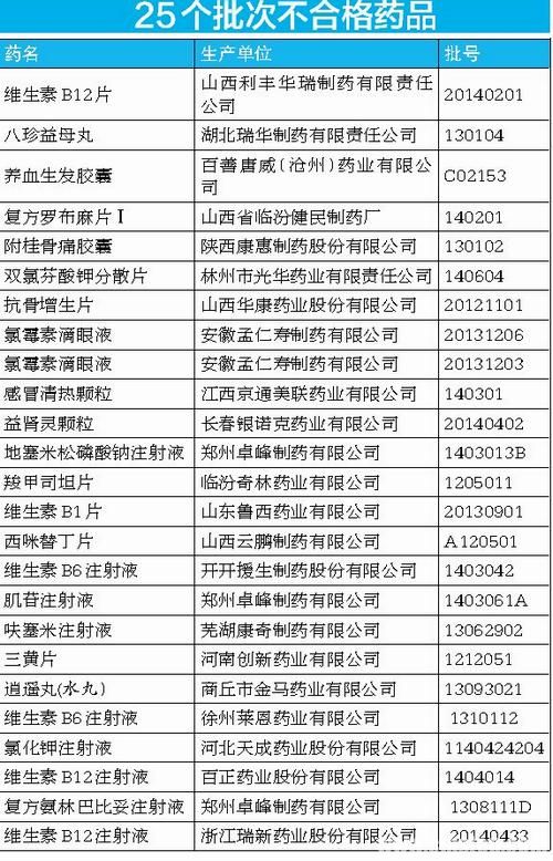 记者了解到,此次公布的25个批次不合格药品分别在省内南平、莆田、龙岩、漳州、福州等多个地市的医院或药店销售,不合格的项目涉及“性状”(药品的颜色形态)、“溶散时限”(即药品的溶散时间限制)、“可见异物”、“装量差异”等。