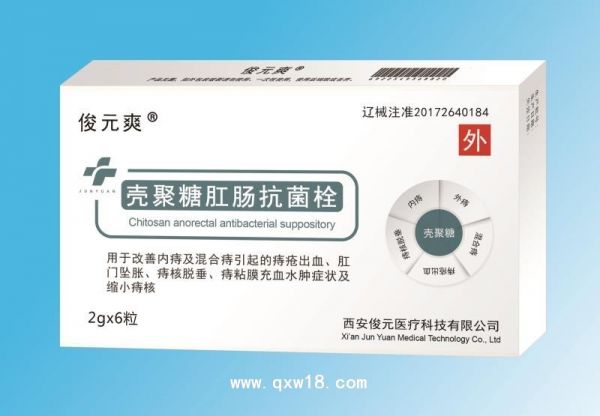 俊元爽壳聚糖肛肠抗菌栓,批准文号:辽食药监械(准)字2013第2640147号,医疗器械招商企业西安俊元医疗科技有限公司招商产品。俊元爽壳聚糖肛肠抗菌栓招商详情请进入>>