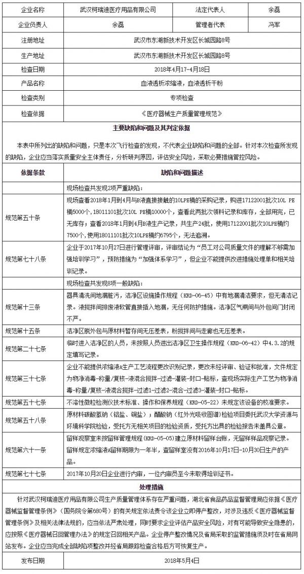 公开资料显示,武汉柯瑞迪医疗用品有限公司成立于2012年,主要从事血液透析浓缩液和透析粉的生产和销售。2015 年取得中华人民共和国医疗器械注册证后,2016年 6 月开始生产相关透析粉、液并推向市场。