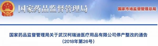 5月14日,国家药品监督管理局发布关于武汉柯瑞迪医疗用品有限公司停产整改的通告。
