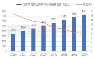 2017年我国三大终端六大市场药品销售数据,药品销售额达到了16118亿元。国内44.70万家药店零售终端销售额占据了22.6%的比重,达到了3647亿元,同比2016年增长了8%。心血管系统药物在药店零售终端市场占据了16%的份额。