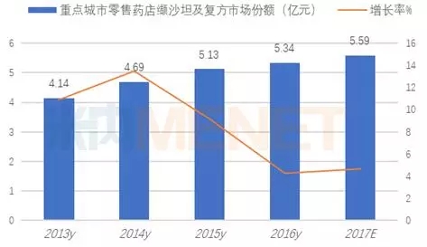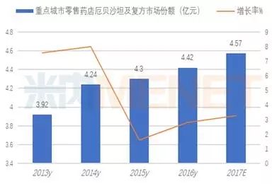 据米内网数据,2016年22个重点城市零售药店的厄贝沙坦系列药物零售额为4.42亿元,同比上一年增长率2.8%。预测2017年厄贝沙坦系列药物零售额为4.57亿元,同比上一年增长了3.29%。