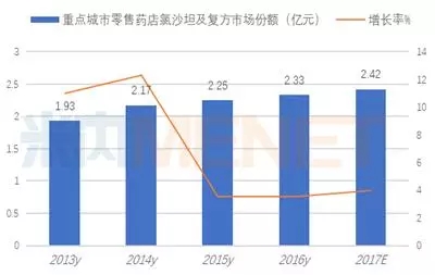 据米内网数据,2016年22个重点城市零售药店的氯沙坦钾系列药物零售额为2.33亿元,氯沙坦占据67.41%,氯沙坦氢氯噻嗪占35.29%。据2017年前3季度数据,预测2017年氯沙坦钾系列药物零售额为2.42亿元,同比上一年增长了3.86%。
