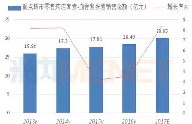 据米内网数据,22个重点城市零售药店的作用于肾素-血管紧张素系统的药物市场为20亿元,同比上一年增长了8.44%。作用于肾素-血管紧张素系统的药物,在心血管系统9个亚类药物中占据了29.14%,估算2017年沙坦类药物市场达到了135亿元的规模。