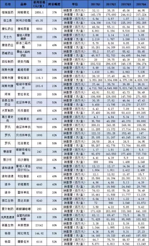 医保谈判目录品种基本实现了以价换量,大多品种在2017年4季度放量明显。