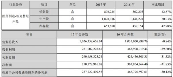 由于第一批谈判成功的三个品种中仅有埃克替尼是国产品种,且整个企业基本99%以上的收入由这个品种贡献,因此2016-2017年整个企业的财务指标运营情况基本就可以这个品种进入医保谈判品种目录之后的情况。