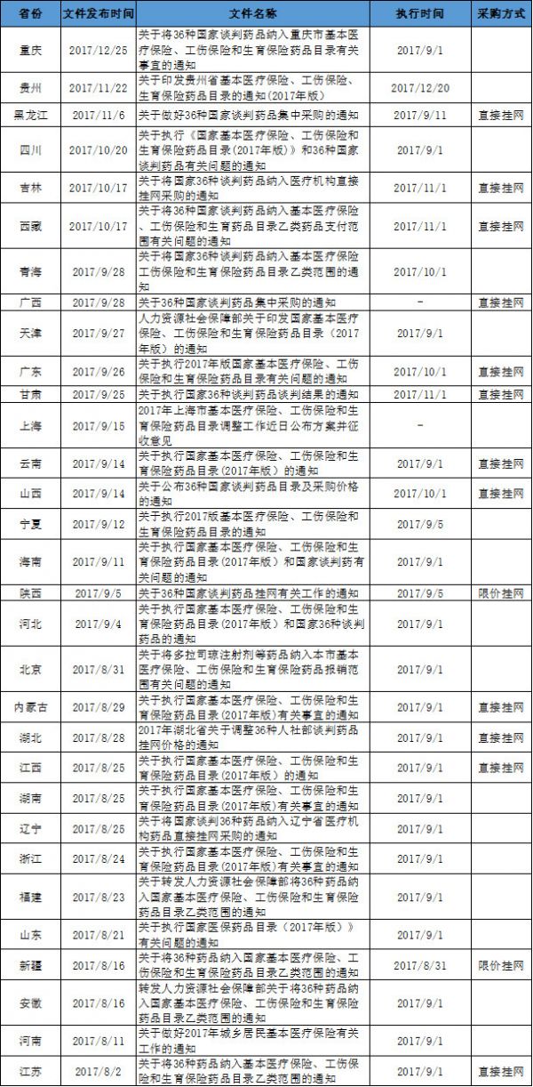 自2017年7月谈判品种确定后,各地陆续出台文件将谈判品种纳入医保,大部分省份在9月1日开始实施,且在大部分省份可以直接挂网采购。