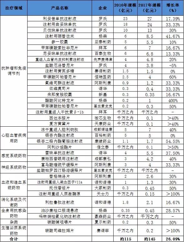 2017年谈判确定的上榜的36个品种涉及26家企业,2016年终端总规模约为115亿元人民币,至2017年大约增长至145亿元,整体的增速超过26%,是2017年医药工业整体销售收入增长率12.2%的两倍多。