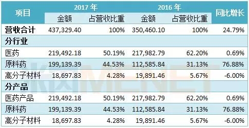 亿帆医药在年报中指出,公司维生素B5产品主要受环保、产能及国外客户库存消化等多重因素影响,市场行情继续持续向好,产品价格较上年同期仍有较大幅提升;此外,高纯丙酸和维生素原B5增速较快,为原料药板块业绩增长做出贡献。2017年公司的原料药及新材料板块营业收入21.78亿元,同比增长64.43%,使得其业绩有较大幅度的增长。