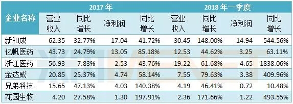 实际上,新和成、亿帆医药、浙江医药等6家维生素龙头企业的业绩已开启了“暴涨”模式。2017年,新和成、亿帆医药和金达威的净利润增幅均在40%以上,兄弟科技和花园生物均实现翻倍;2018年一季度,新和成则成为了“黑马”,净利润近15亿元;此外,浙江医药一季度净利润已超去年全年,同比增长高达1838.06%。