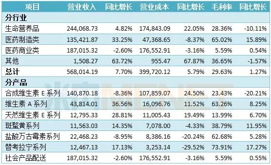 浙江医药主营业务为生命营养品、医药制造类产品及医药商业。其中,生命营养品主要为合成维生素E、维生素A、天然维生素E、维生素H、维生素D3、辅酶Q10、β-胡萝卜素、斑蝥黄、番茄红素等脂溶性维生素和类胡萝卜素产品。