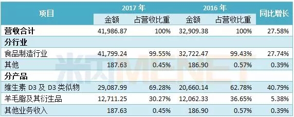 花园生物主营业务是维生素D3上下游系列产品的研发、生产和销售。主要产品有维生素D3、25-羟基维生素D3原、胆固醇及精制羊毛脂。2017年,营业收入4.20亿元,同比增长27.58%;净利润1.30亿元,同比增长197.91%。业绩增长主要是25-羟基维生素D3原产品销量增加以及维生素D3产品售价上升所致。