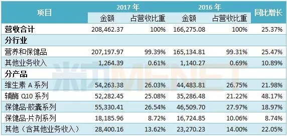 金达威是从事食品营养强化剂行业原料和保健食品终端产品的生产、销售业务。2017年,营业收入达20.85亿元,同比25.37%;净利润4.74亿元,同比增长58.14%。金达威表示,公司的辅酶Q10销量大幅增加,维生素D3价格触底快速反弹,维生素A受原料供应紧张等因素影响其价格在第四季度出现爆发式上涨,加上海外子公司加强营销,业绩再创新高。