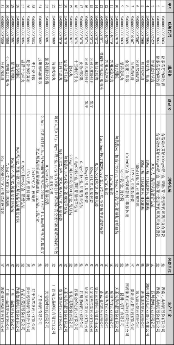 记者梳理发现,本批发布的新进医保目录药品包含国药集团宜宾制药有限责任公司的金莲花口服液、昆明中药厂有限公司的感冒疏风丸、芜湖绿叶制药有限公司的消炎利胆软胶囊、齐鲁制药有限公司的拉坦噻吗滴眼液等31品规,将挂网议价(文末附清单)。