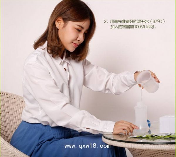 [使用说明]:清洁双手,将温开水倒入洗鼻器,水温以自我感觉舒适为宜,至300毫升刻度线,取一袋洗鼻剂倒入洗鼻器内,盖好瓶盖、摇匀。根据需要选择喷头的出水模式(1.喷头收短锁住,水流为雾状2.喷头拉长,水流为柱状),将洗鼻器的喷头塞住一侧鼻孔,身体稍微向前倾,张嘴,用嘴呼吸,停止用鼻子呼吸,按压洗鼻器手柄,一按一松,有节奏进行,即可将洗液持续不断挤入鼻腔,开始洗鼻过程。