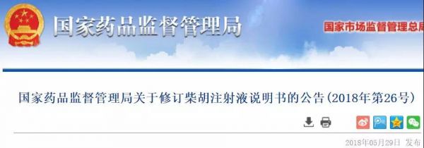 5月29日,国家药品监督管理局发布《关于修订柴胡注射液说明书的公告(2018年第26号)》。