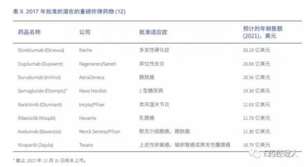 尽管行业专家多年来反复预测“重磅炸弹式药物的时代即将结束”,但利润丰厚的产品仍在不断涌现。根据 Clarivate Analytics公布的年度分析,2017年批准的八种新药有可能成为超级药物,即在上市的五年内实现至少10亿美元的年销售额。潜在重磅炸弹药物中四种为肿瘤治疗药物,其他还包括治疗糖尿病和类风湿关节炎等高患病率的药物。位列2017年重磅炸弹药物首位的是罗氏治疗多发性硬化的 Ocrevus(奥瑞珠单抗),预计其 2021年销售额将超过33亿美元(见表2)。