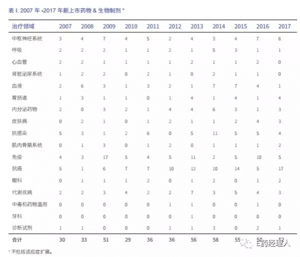 2017年批准的NMEs和生物制剂中,抗肿瘤药物表现最活跃,推出了17种新产品,是过去十年中数量最多的一年;孤儿药继续成为新药研发的重点,去年获批的新药和生物制剂(包括产品线拓展产品)中,有31种获得孤儿药资格,其中部分对应多个适应症。