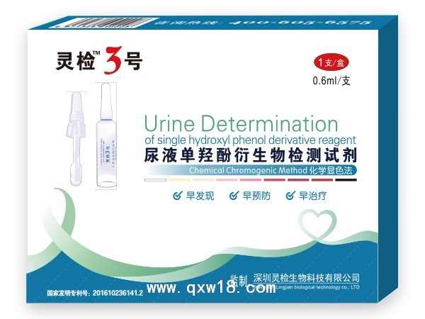 灵检三号,即尿液单羟酚衍生物检测试剂,是灵检生物研发的一种用于早期发现肿瘤的癌症尿液检测试剂,准确率高达96.8%,整个检测过程,只需要3毫升尿液,3分钟就可以轻松检测,操作简单,在家里就可以自行操作。
