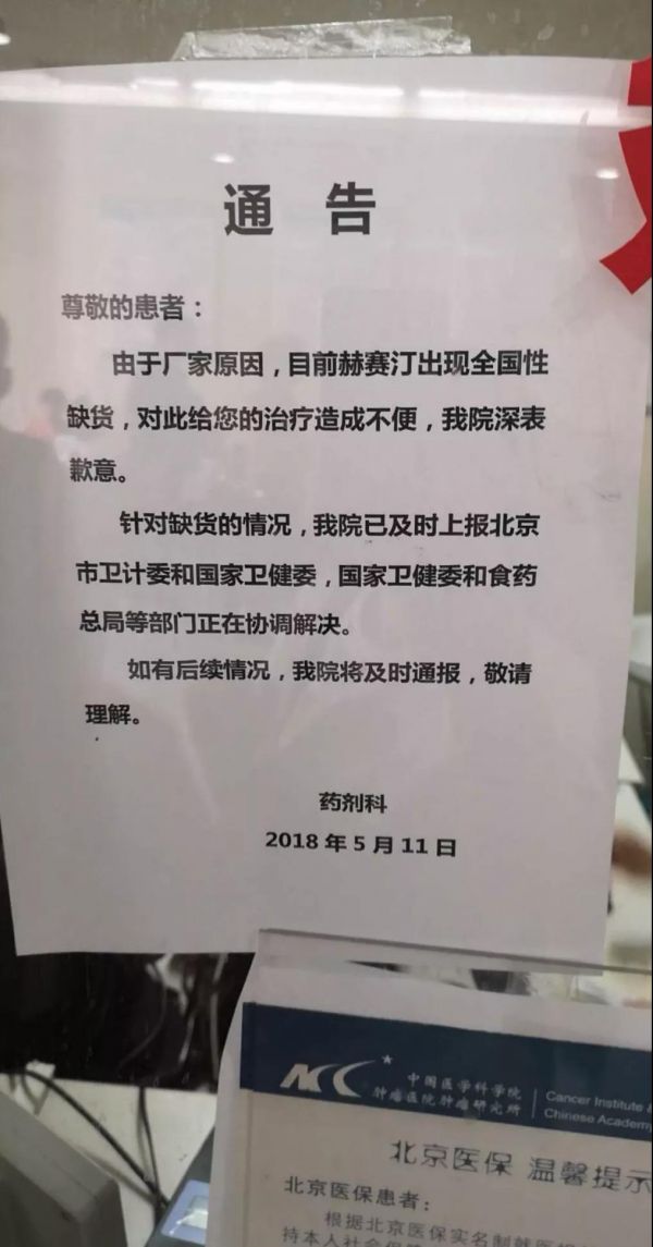 (5月,悬挂于北京中国医学科学院肿瘤医院挂号处的赫赛汀断货通知)