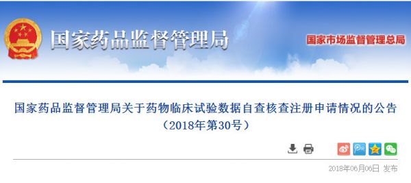 6月6日,国家药监局发布《国家药品监督管理局关于药物临床试验数据自查核查注册申请情况的公告(2018年第30号)》(以下简称《公告》)。